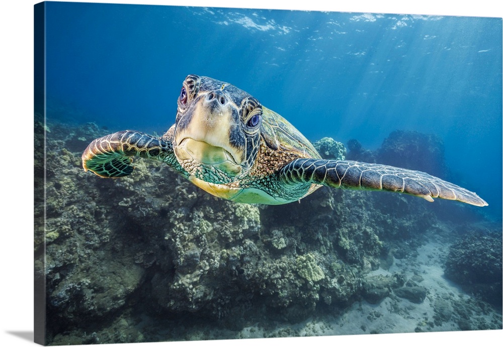 <p>Close-up portrait of a Green Sea Turtle (Chelonia mydas), an endangered species, underwater off West Maui, Hawaii, USA; Hawaii, United States of America</p>