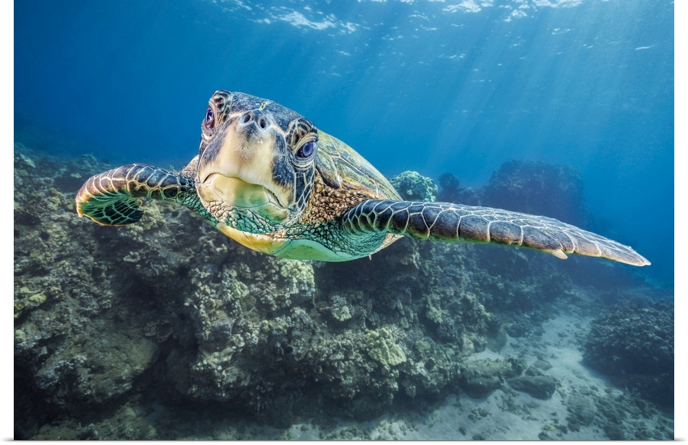<p>Close-up portrait of a Green Sea Turtle (Chelonia mydas), an endangered species, underwater off West Maui, Hawaii, USA; Hawaii, United States of America</p>
