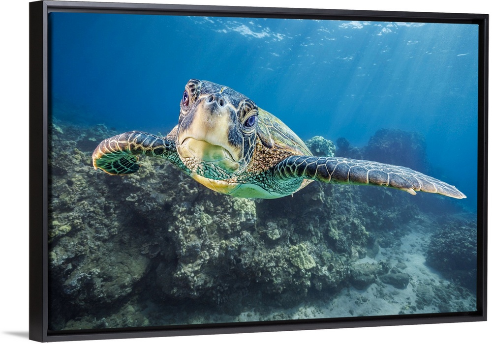 <p>Close-up portrait of a Green Sea Turtle (Chelonia mydas), an endangered species, underwater off West Maui, Hawaii, USA; Hawaii, United States of America</p>