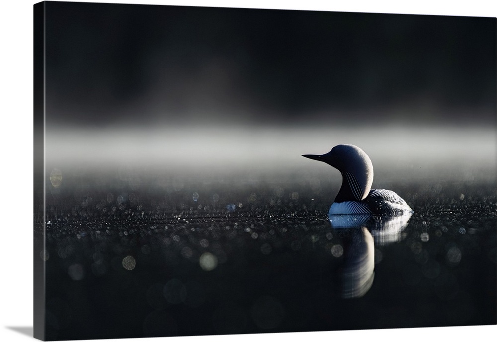 <p>Close-up portrait of a pacific loon (Gavia Pacifica) swimming in the calm, misty waters of echo lake. Whitehorse, Yukon, Canada.</p>