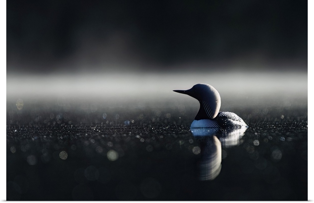 <p>Close-up portrait of a pacific loon (Gavia Pacifica) swimming in the calm, misty waters of echo lake. Whitehorse, Yukon, Canada.</p>