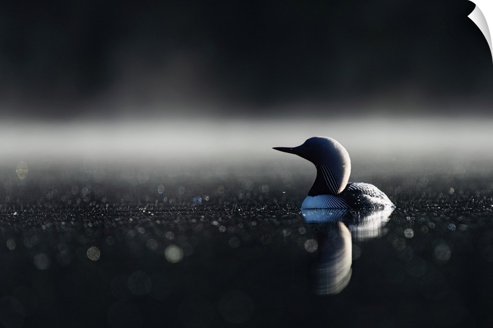 <p>Close-up portrait of a pacific loon (Gavia Pacifica) swimming in the calm, misty waters of echo lake. Whitehorse, Yukon, Canada.</p>