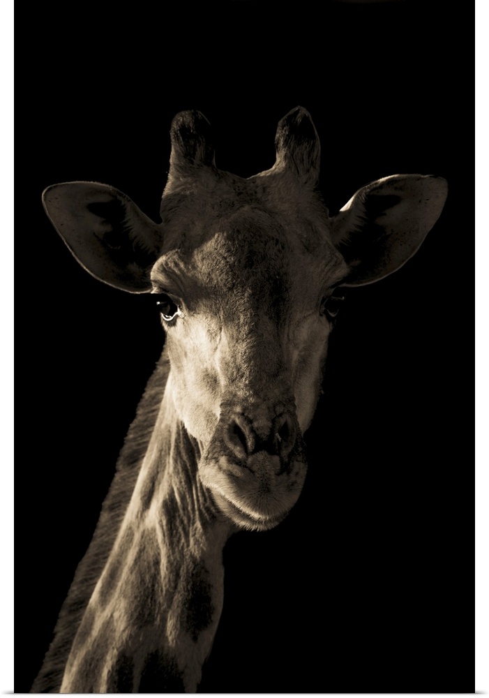 <p>Close-up portrait of a southern giraffe's head and neck (Giraffa giraffa) dramatically sidelit by the early morning light against a pure black background at the Gabus Game Ranch, Otavi, Otjozondjupa, Namibia</p>