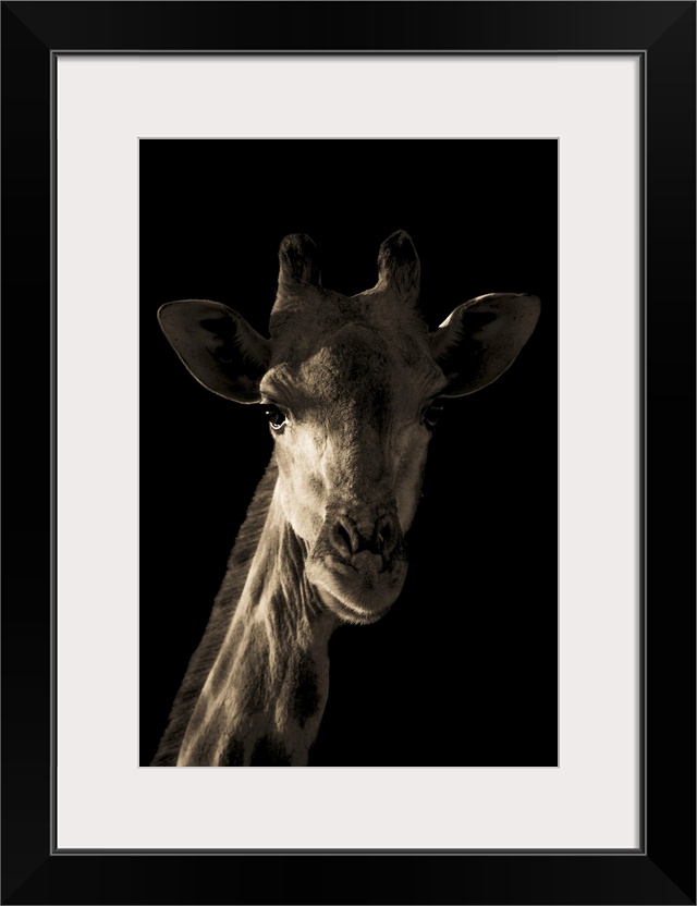 <p>Close-up portrait of a southern giraffe's head and neck (Giraffa giraffa) dramatically sidelit by the early morning light against a pure black background at the Gabus Game Ranch, Otavi, Otjozondjupa, Namibia</p>
