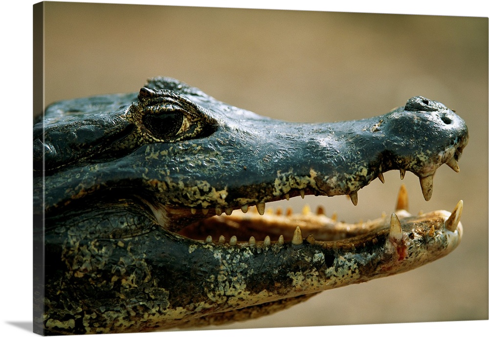 <p>Close-up portrait of a speckled caiman (caiman crocodilus) in the Pantanal region of Brazil. Pantanal, Brazil.</p>