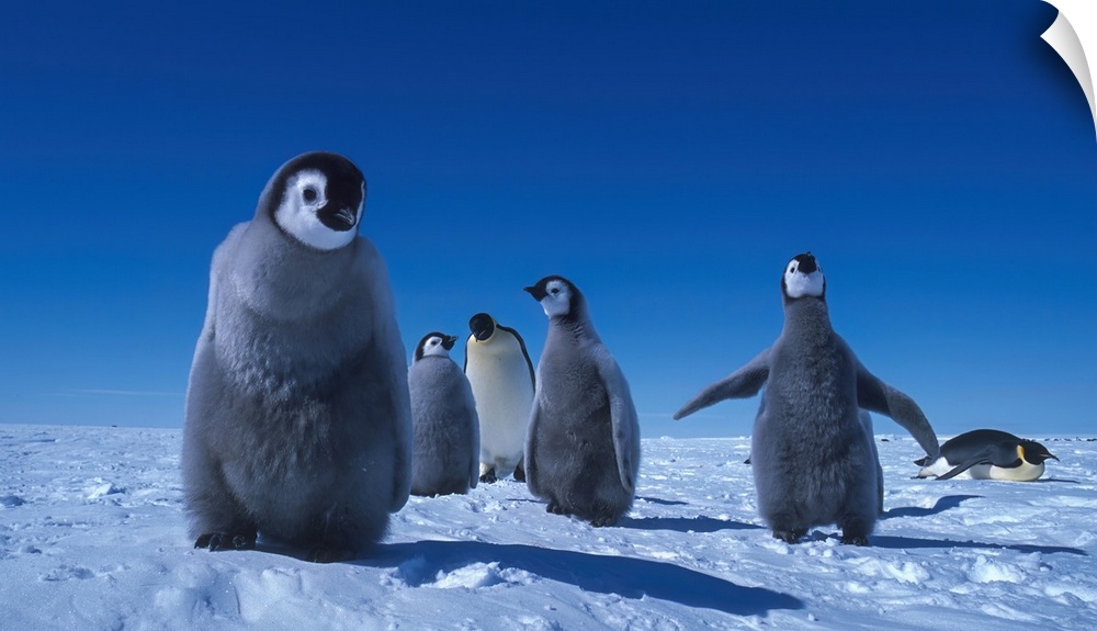 <p>Close-up portrait of Emperor Penguin Chicks (Aptenodytes forsteri) standing on icy landscape under a blue sky, Atka Bay Rookery, Weddell Sea, Antarctica</p>