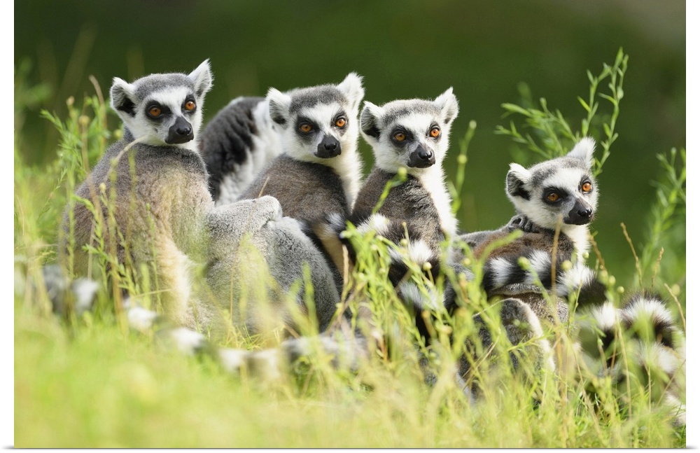 <p>Close-up Portrait of Four Ring-tailed Lemurs (Lemur catta) sitting in Meadow in summer, Zoo Augsburg, Swabia, Bavaria, Germany</p>