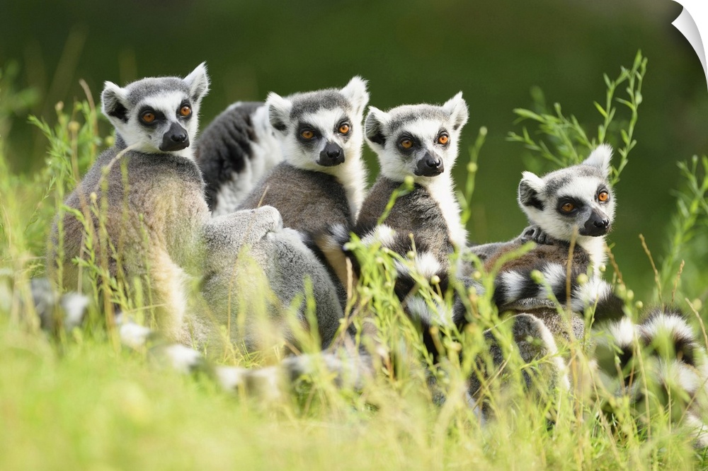 <p>Close-up Portrait of Four Ring-tailed Lemurs (Lemur catta) sitting in Meadow in summer, Zoo Augsburg, Swabia, Bavaria, Germany</p>