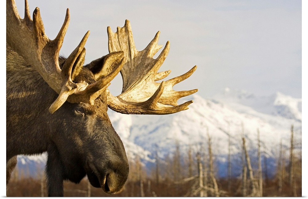 <p>Up-close photograph of moose with snow covered mountains in the background.</p>