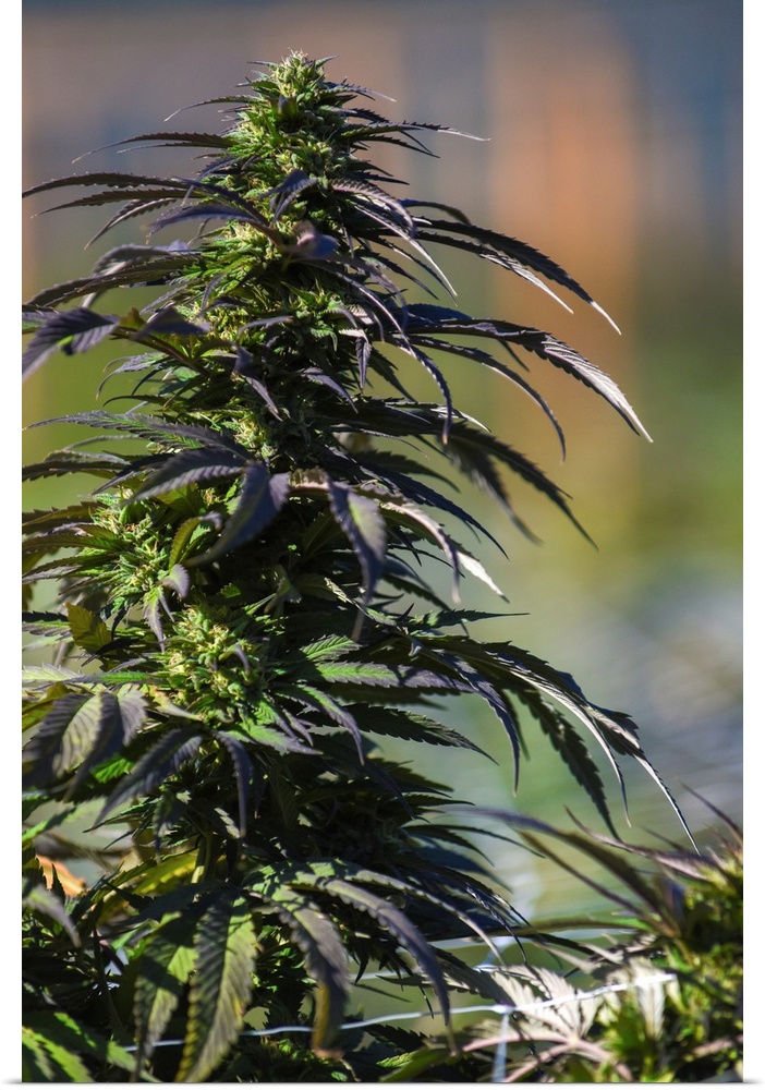 <p>Close up shot of buds and leaves of Cannabis plant, growing in outdoor cultivation facility, Colorado</p>