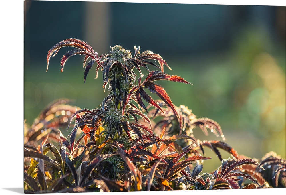 <p>Close up shot of buds and leaves of Cannabis plant, growing in outdoor cultivation facility, Colorado</p>