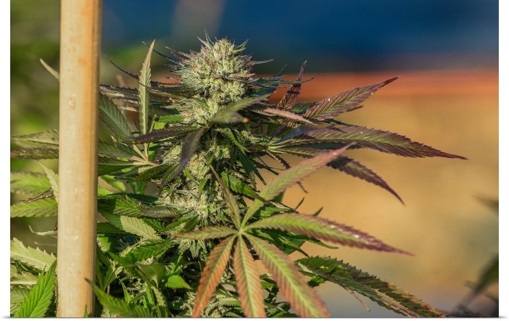 <p>Close up shot of buds and leaves of staked Cannabis plant, growing in outdoor cultivation facility, Colorado</p>