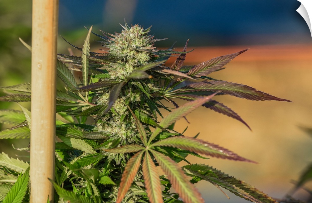 <p>Close up shot of buds and leaves of staked Cannabis plant, growing in outdoor cultivation facility, Colorado</p>