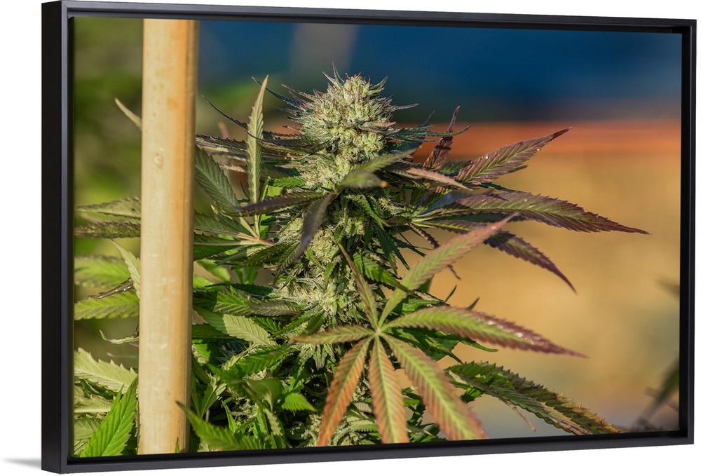 <p>Close up shot of buds and leaves of staked Cannabis plant, growing in outdoor cultivation facility, Colorado</p>