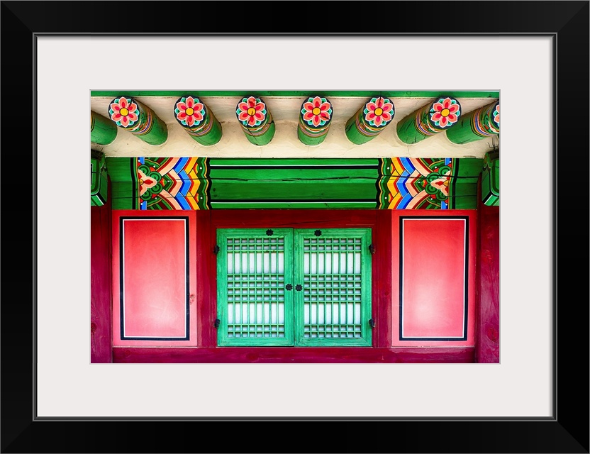<p>Intricately painted beams and window shutters on the Royal Palace in Seoul, South Korea</p>