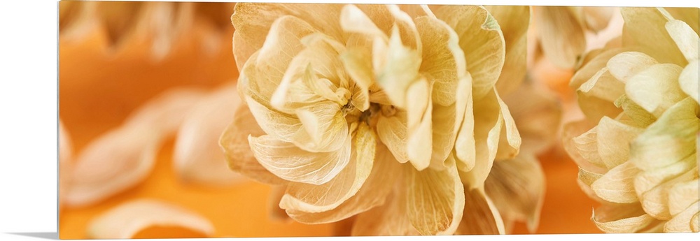 <p>Close up view of dry hop seed cones near petals on yellow, panoramic shot.</p>
