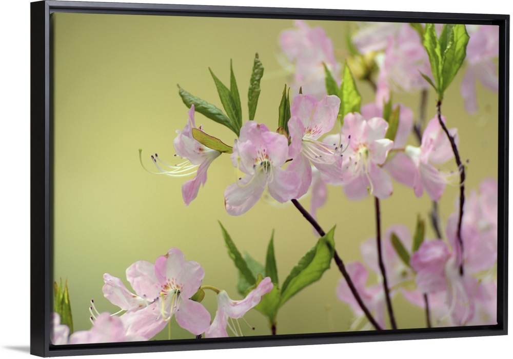 <p>Close view of pink azalea branches, Rhododendron species. Cambridge, Massachusetts.</p>