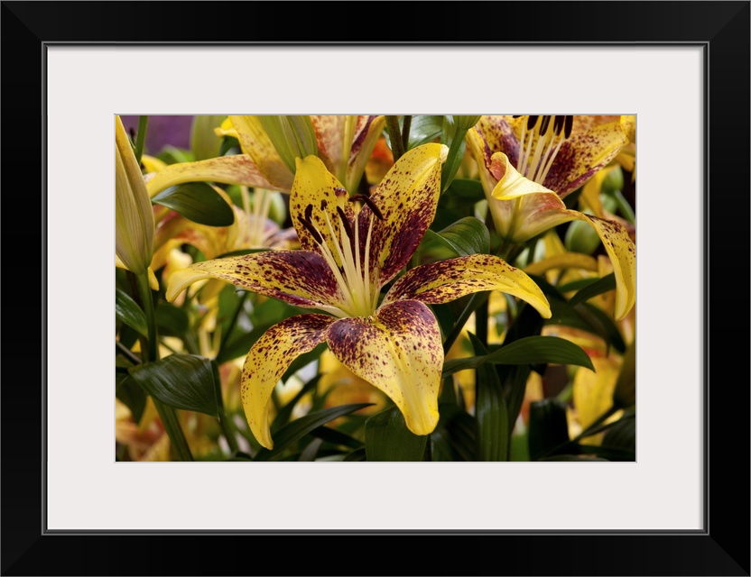 <p>Close view of yellow lilies with red spots. Longwood Gardens, Pennsylvania.</p>