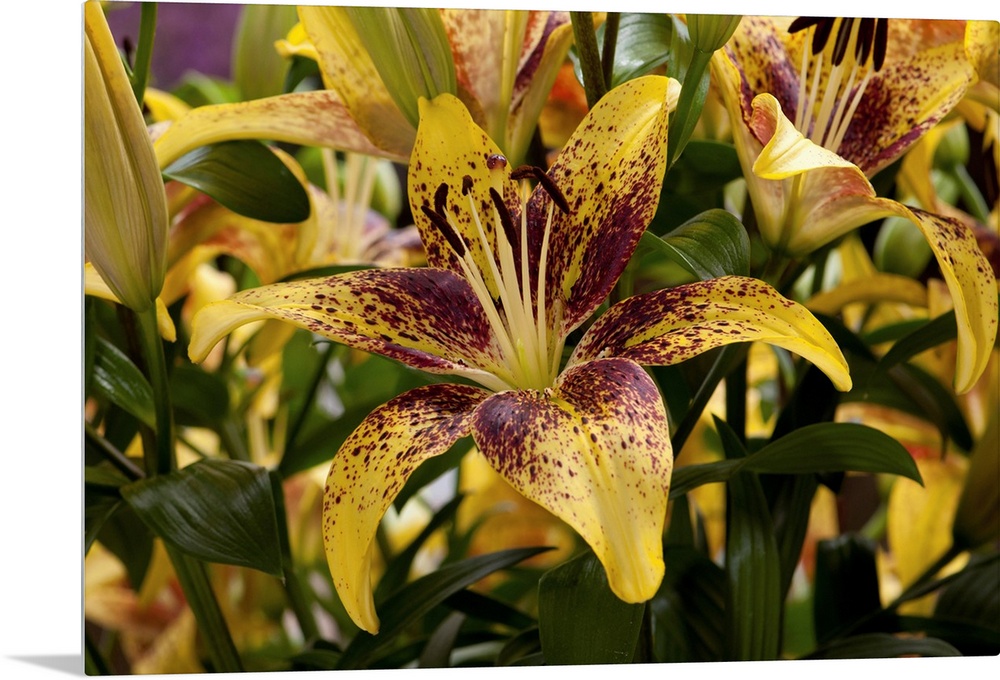 <p>Close view of yellow lilies with red spots. Longwood Gardens, Pennsylvania.</p>
