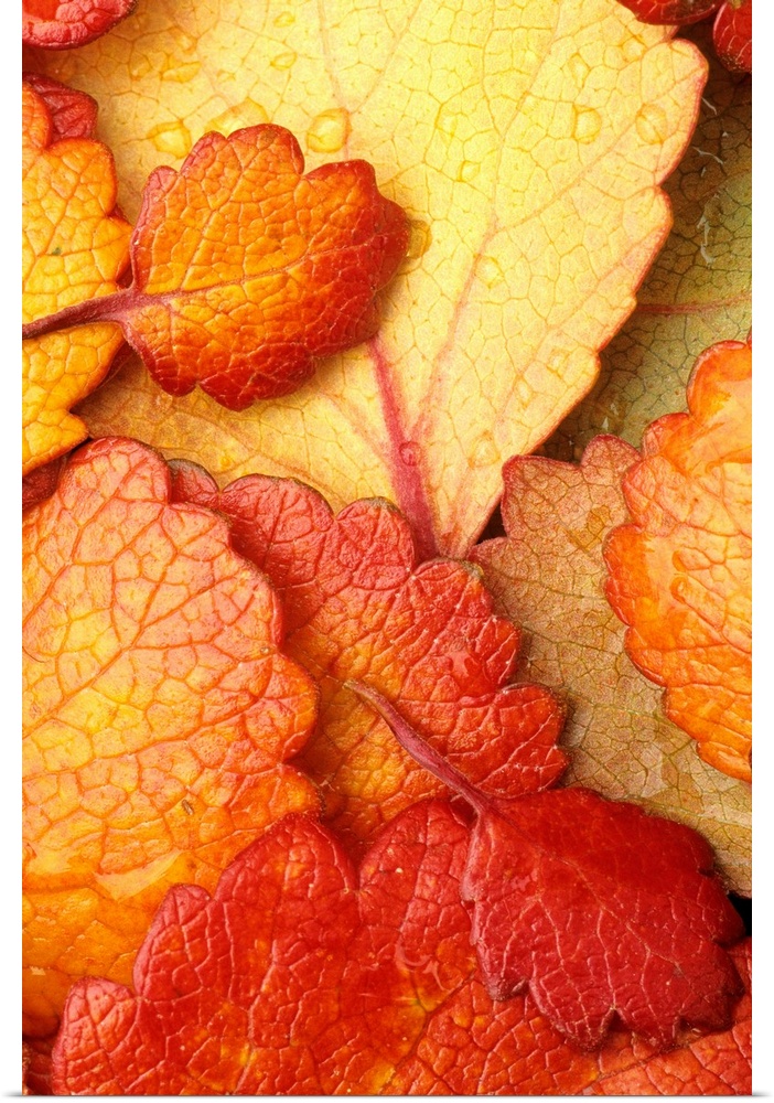 <p>Close-up of Dwarf Birch Leaves Autumn, Alaska, Brooks Range, Marion Creek. A collection of overlapping fall foliage.</p>