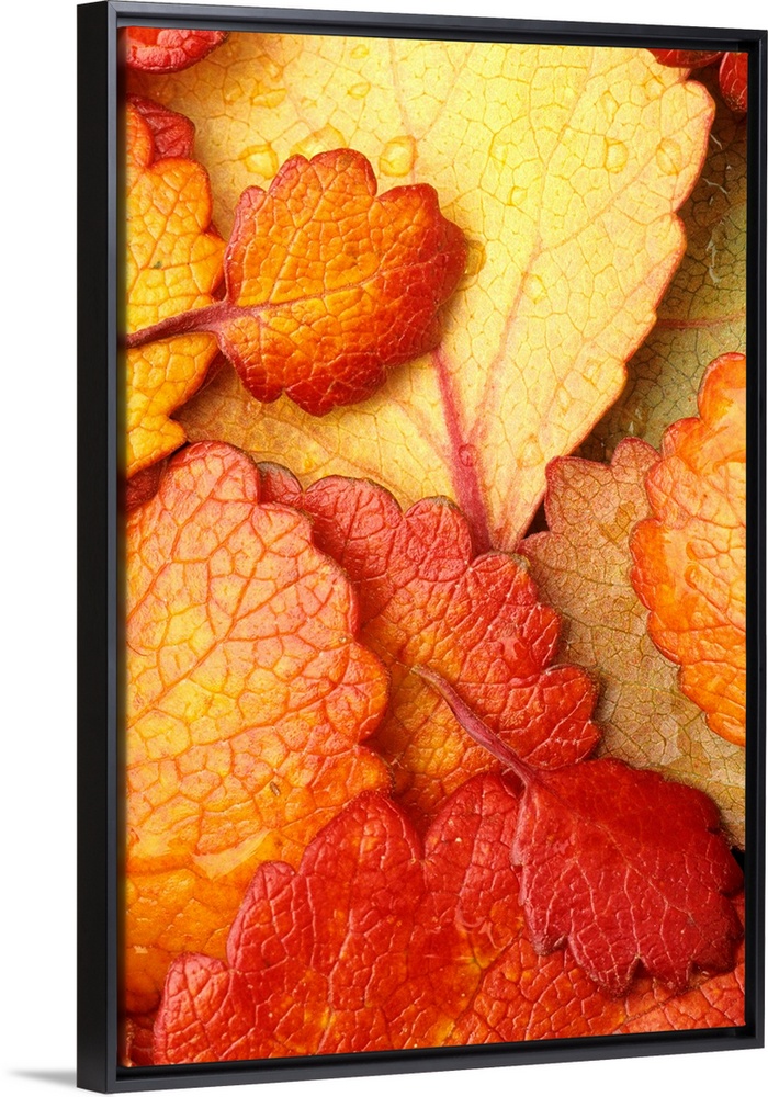 <p>Close-up of Dwarf Birch Leaves Autumn, Alaska, Brooks Range, Marion Creek. A collection of overlapping fall foliage.</p>