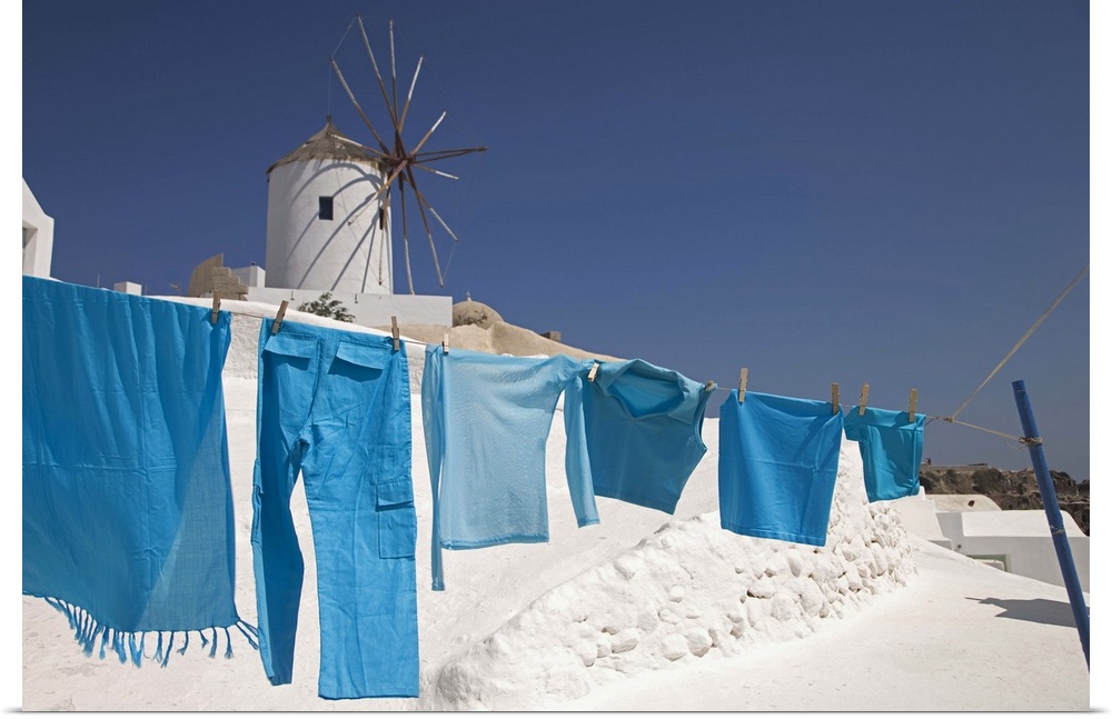 <p>Greece, Santorini, Oia, clothes drying, windmill in background</p>
