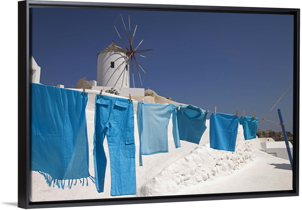 <p>Greece, Santorini, Oia, clothes drying, windmill in background</p>