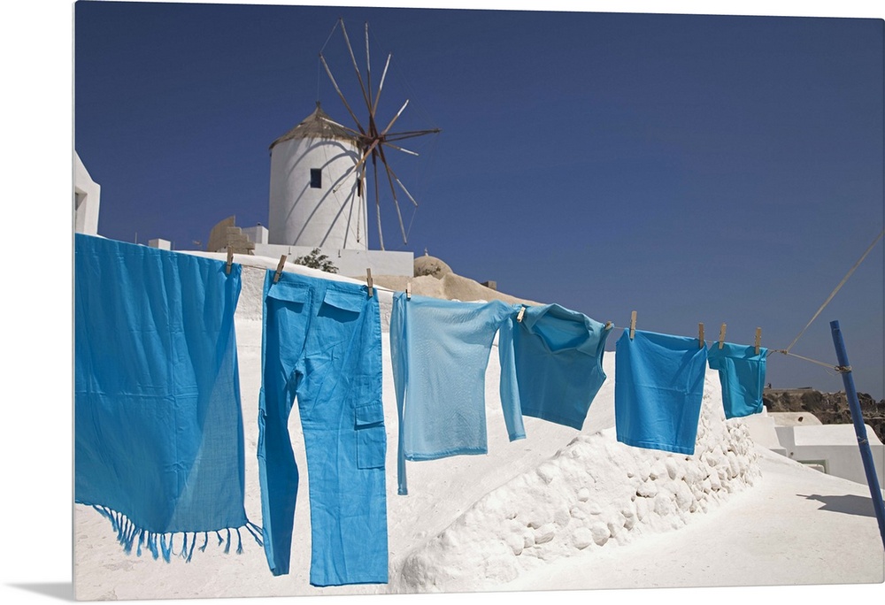 <p>Greece, Santorini, Oia, clothes drying, windmill in background</p>