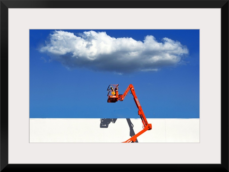 <p>A boom lift raised near a white wall, with a cloud overhead, appearing out of reach.</p>