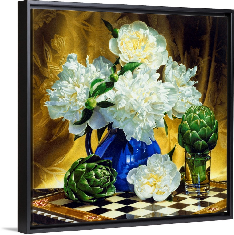 <p>Contemporary vivid realistic still-life painting of white flowers in a blue vase with artichoke heads sitting on a chess board, with a gold cloth backdrop.</p>