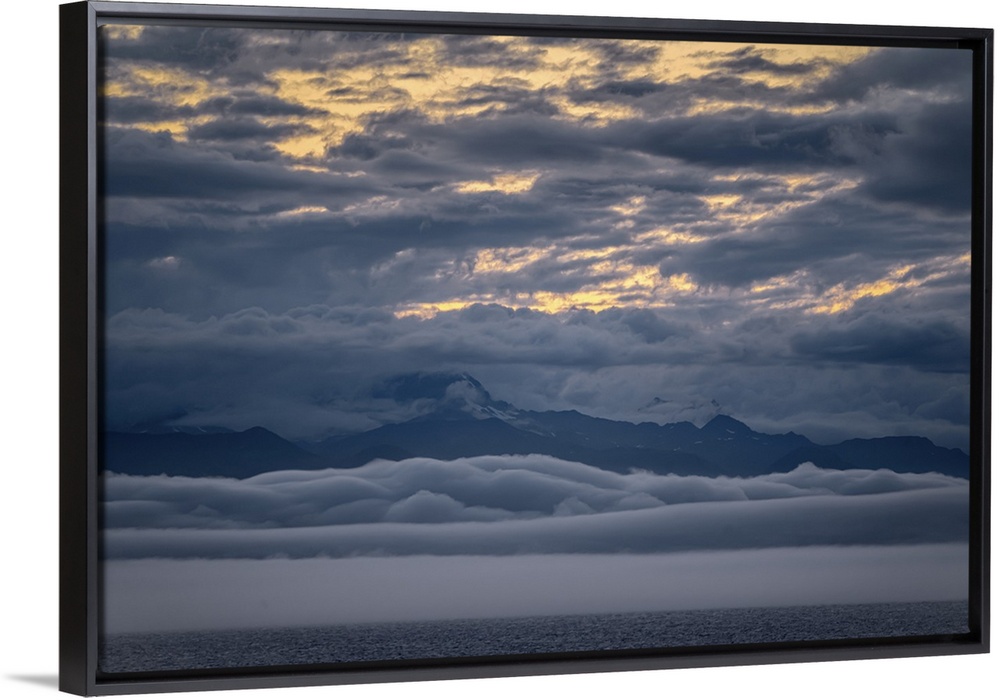 <p>Peaceful snow-capped Alaskan mountain range at ocean's edge with clouds above and clouds below (cloud inversion) make for a stunning and dramatic scene. Horizontal landscape version.</p>