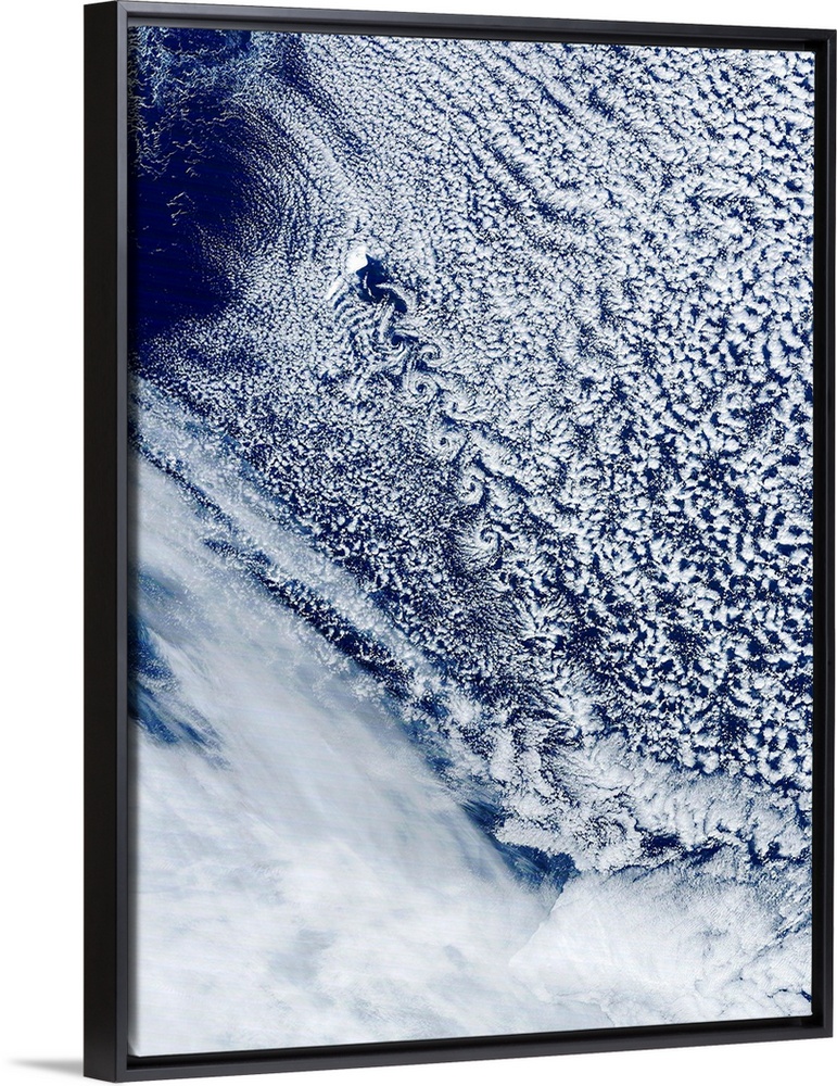 <p>Cloud vortex street, satellite image. North is at top. The island of Jan Mayen (white, upper left) is located in the Arctic Ocean. It is casting a cloud vortex street (swirls running diagonally across centre) as winds flow around it. These are also known as Von Karman vortices. Image data obtained on 5 April 2012, with the MODIS (Moderate Resolution Imaging Spectroradiometer) sensor on one of NASA's Earth Observing System satellites (Terra and Aqua).</p>