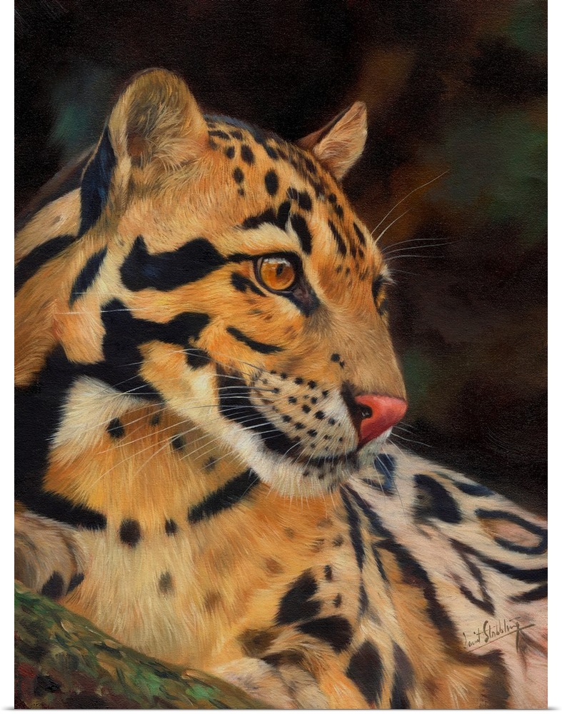<p>Contemporary painting of a clouded leopard looking at something with intent.</p>