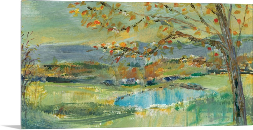 <p>A large horizontal landscape of a pond in a field with a tree in the foreground.</p>