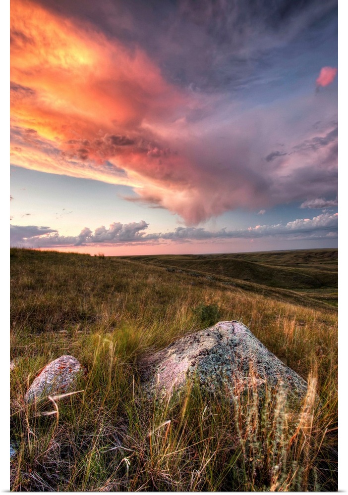 <p>Clouds Lit At Sunset With Some Glacial Erratics Lying In Grasslands National Park;Saskatchewan Canada</p>