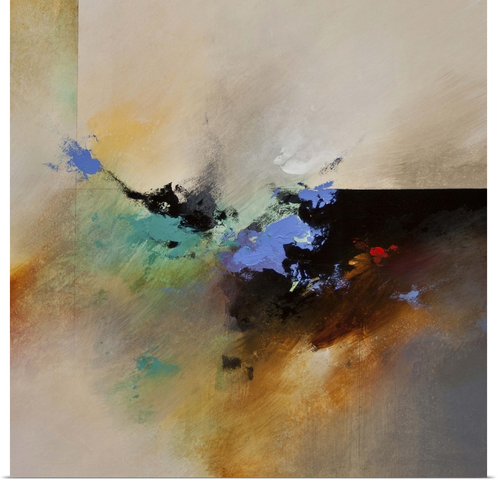 <p>Square contemporary abstract painting in tan, green, and blue.</p>