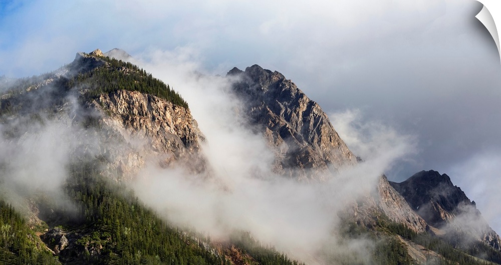 <p>Clouds gather around rocky mountain peaks, field, British Columbia, Canada.</p>