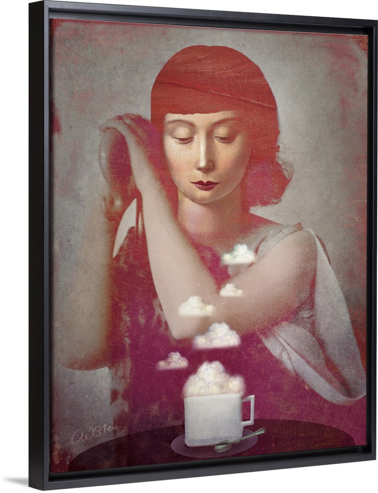 <p>A portrait of a lady sitting at a table with a cup of clouds.</p>
