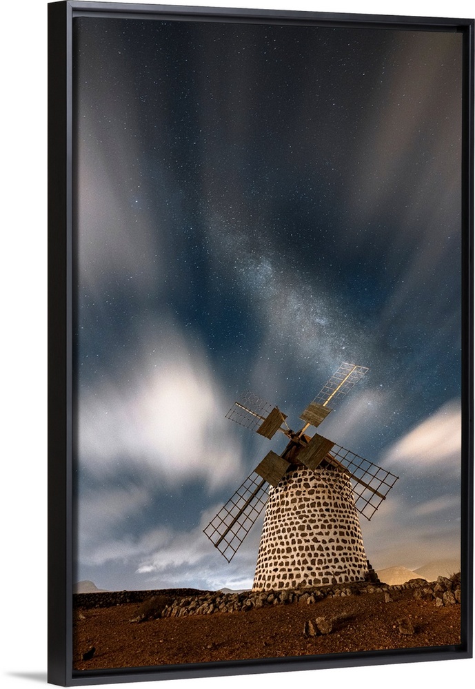 <p>Long exposure image of clouds in the night sky over the old windmill, La Oliva, Fuerteventura, Canary Islands, Spain, Atlantic, Europe</p>