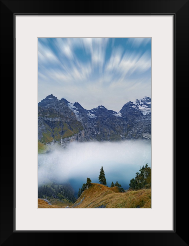 <p>Clouds in the sky above lake Oeschinensee covered by fog, Bernese Oberland, Kandersteg, canton of Bern, Switzerland, Europe</p>