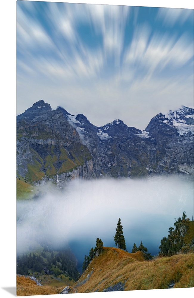 <p>Clouds in the sky above lake Oeschinensee covered by fog, Bernese Oberland, Kandersteg, canton of Bern, Switzerland, Europe</p>