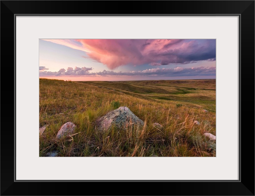 <p>Clouds Lit At Sunset With Some Glacial Erratics Lying In Grasslands National Park;Saskatchewan Canada</p>