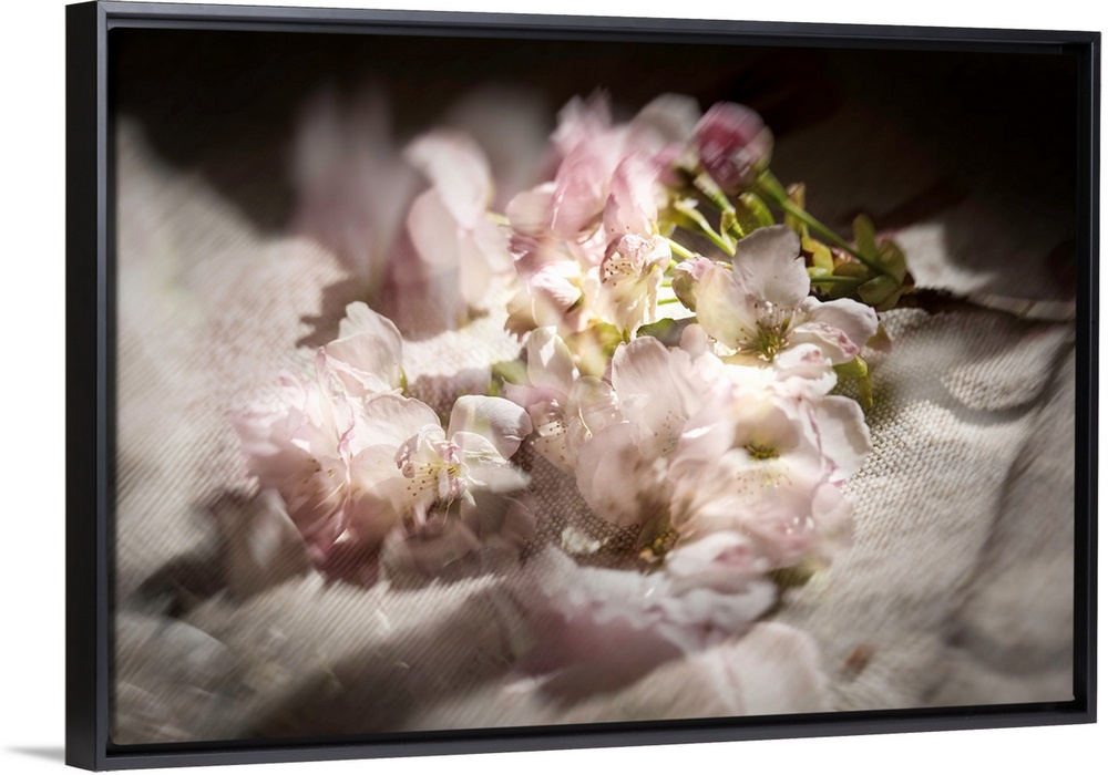 <p>Dreamy photograph of cherry blossom flowers on linen with multiple exposures.</p>