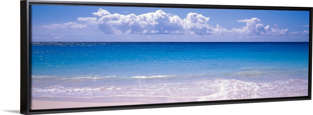 <p>Panoramic photograph shows the sparkly water of an ocean slowly coming into shore on a bright and sunny day.</p>