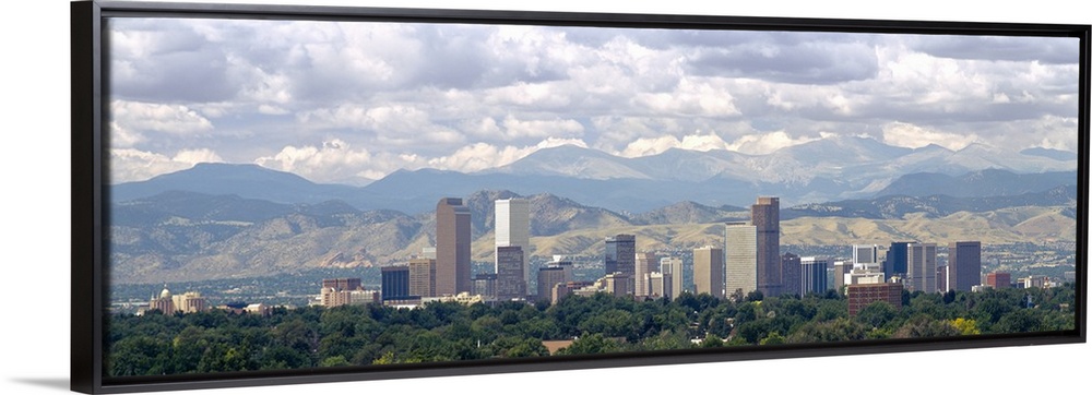 <p>Panoramic photograph shows a line of skyscrapers in a capital city within the Midwestern United States during a cloud-filled day. In the background there is a mountain range fading into the distance.</p>