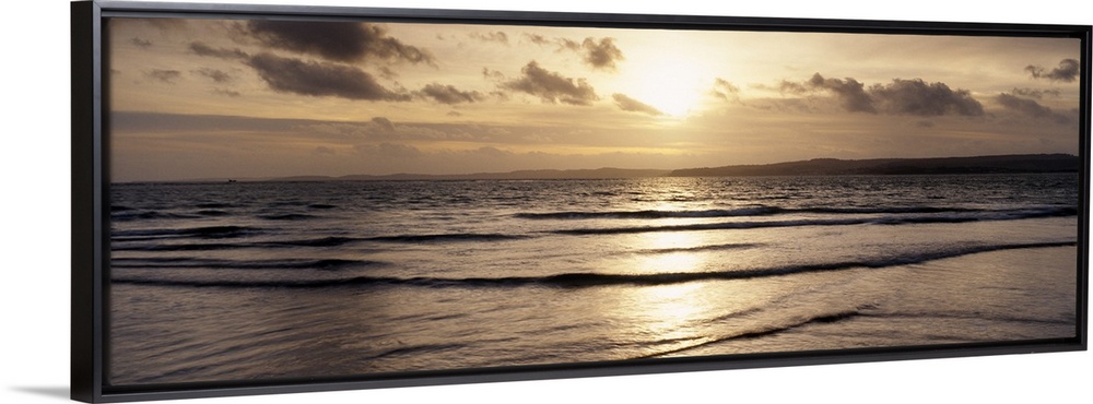 <p>Panoramic photo of the setting sun shining down on the ocean and beach.</p>