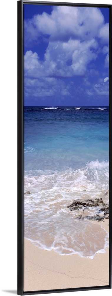 <p>Vertical, large photograph of clear blue waters hitting the beach beneath a blue sky with billowing clouds in Island Harbour, Anguilla.</p>