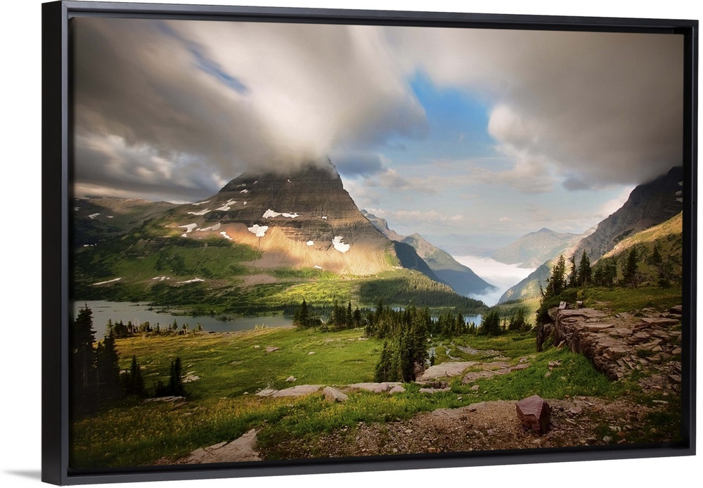 <p>Severe weather at sunrise at Logan Pass in Montana. Green grass, pine trees, alpine lakes, snow, cliffs, clouds and fog.</p>