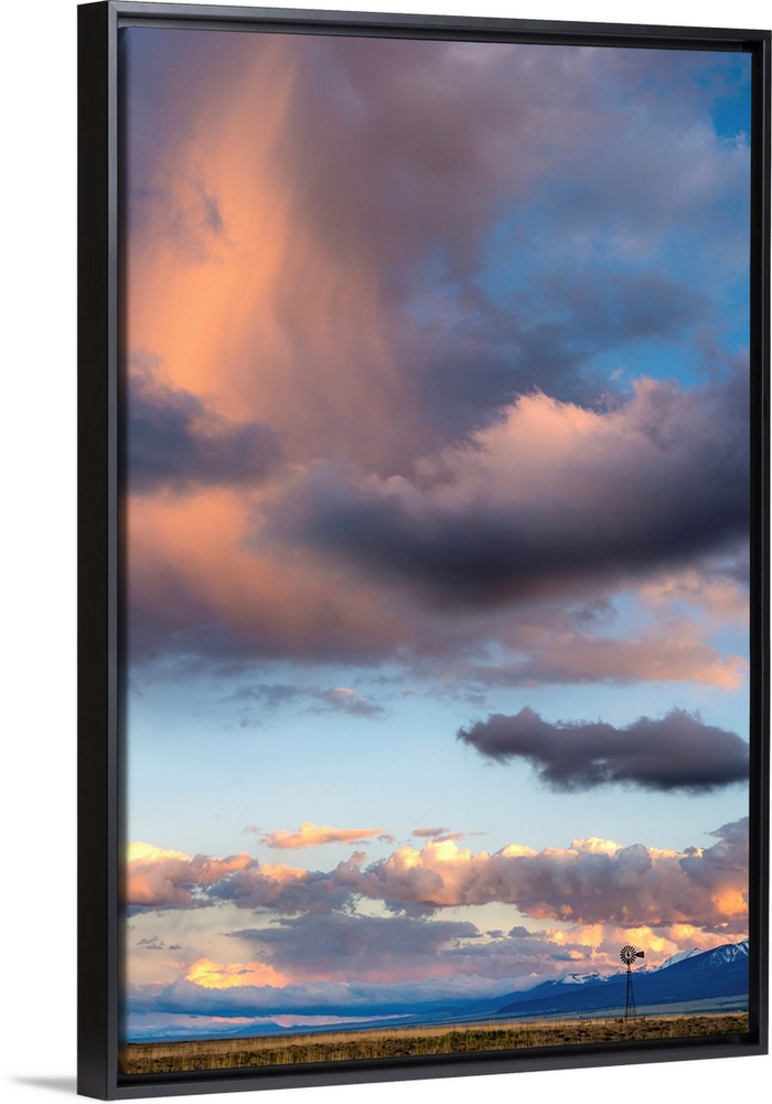<p>Landscape photograph of a field with a windmill set in front of mountains with a cloudy sunset sky.</p>
