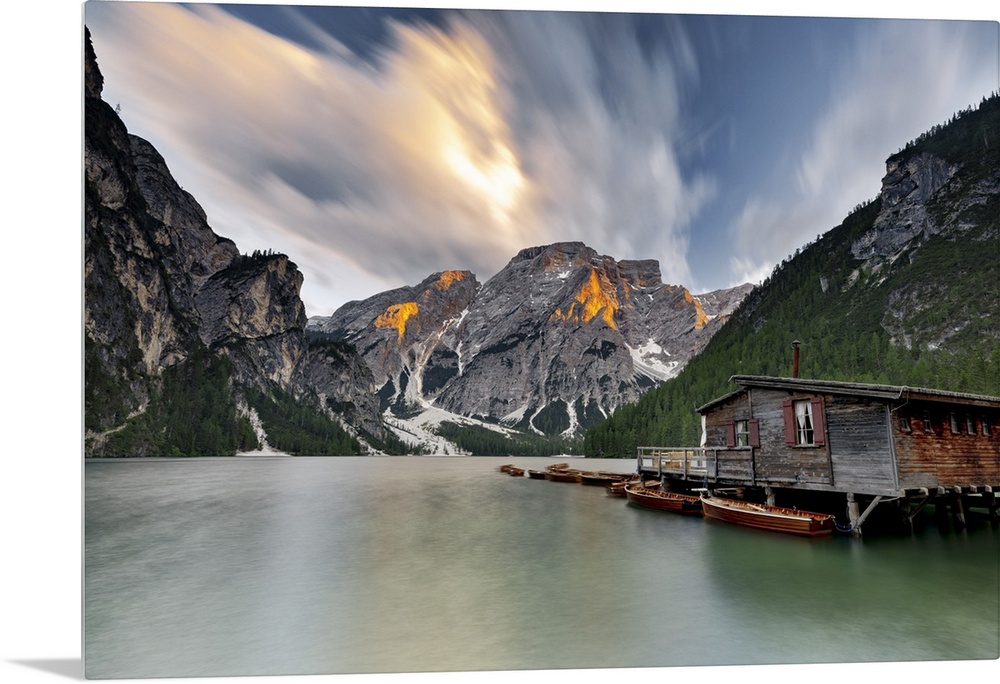 <p>Cloudy sky at sunset over Croda del Becco and Lake Braies (Pragser Wildsee), Dolomites, South Tyrol, Italy, Europe</p>